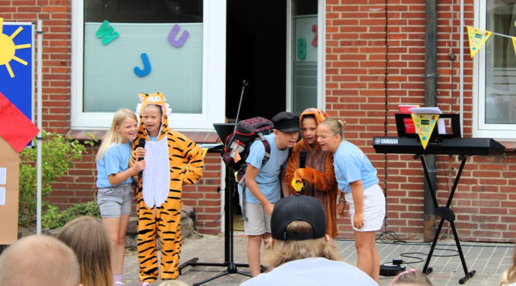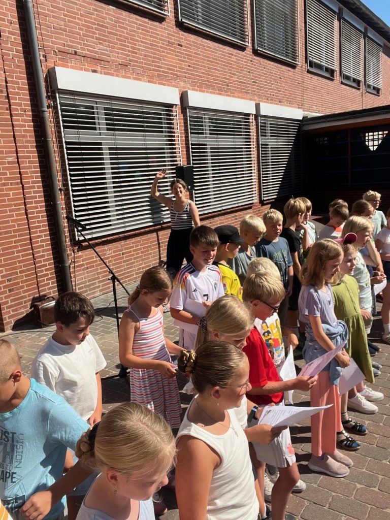 Am Samstag, dem 16.08.2025 durften wir 36 neue Erstklässlerinnen und Erstklässler bei uns auf dem Schulinnenhof zur Einschulungsfeier 2025 begrüßen. Nach einem religiösen Impuls, der Vorstellungsrunde des Kollegiums, einem Theaterstück und der Schulhymne konnten die neuen Kinder ihre erste Unterrichtsstunde bei uns an der Schule erleben. In der Zwischenzeit hatten die Eltern im Stehcafe Zeit sich untereinander und das Kollegium näher kennenzulernen.