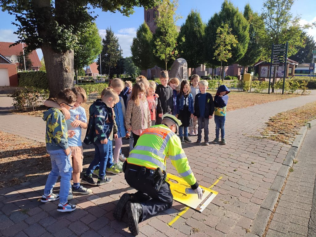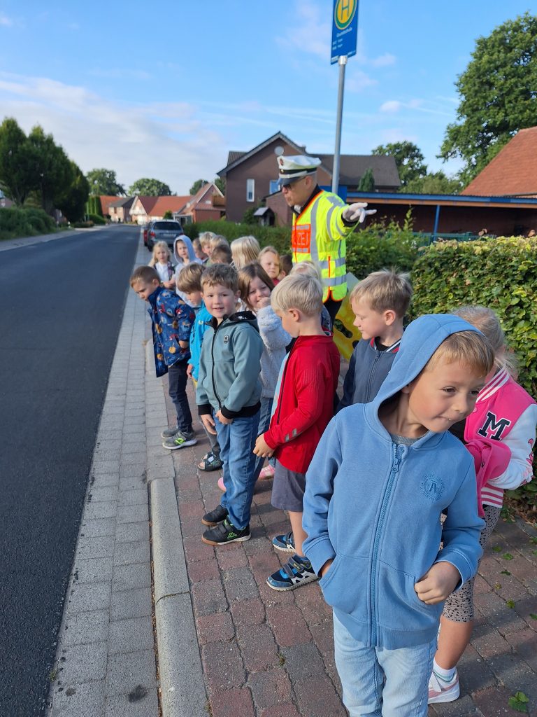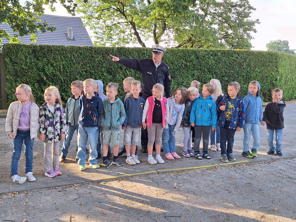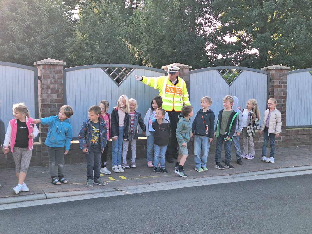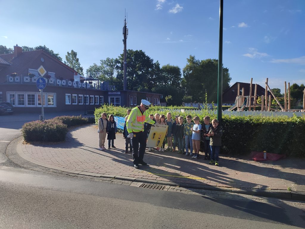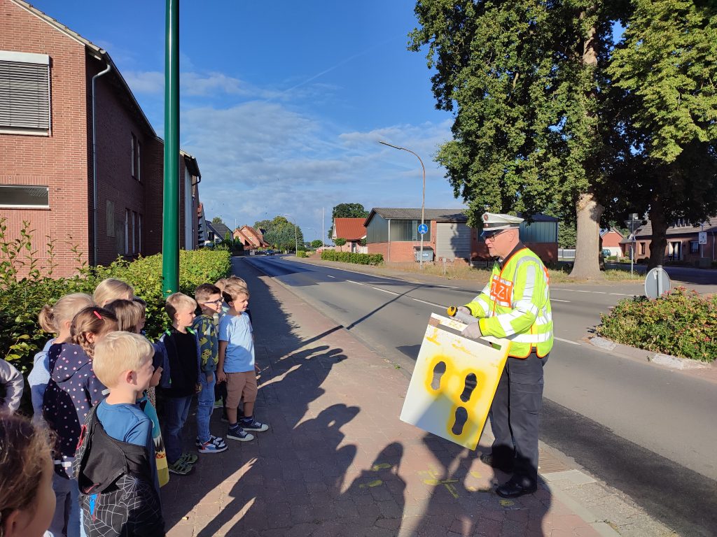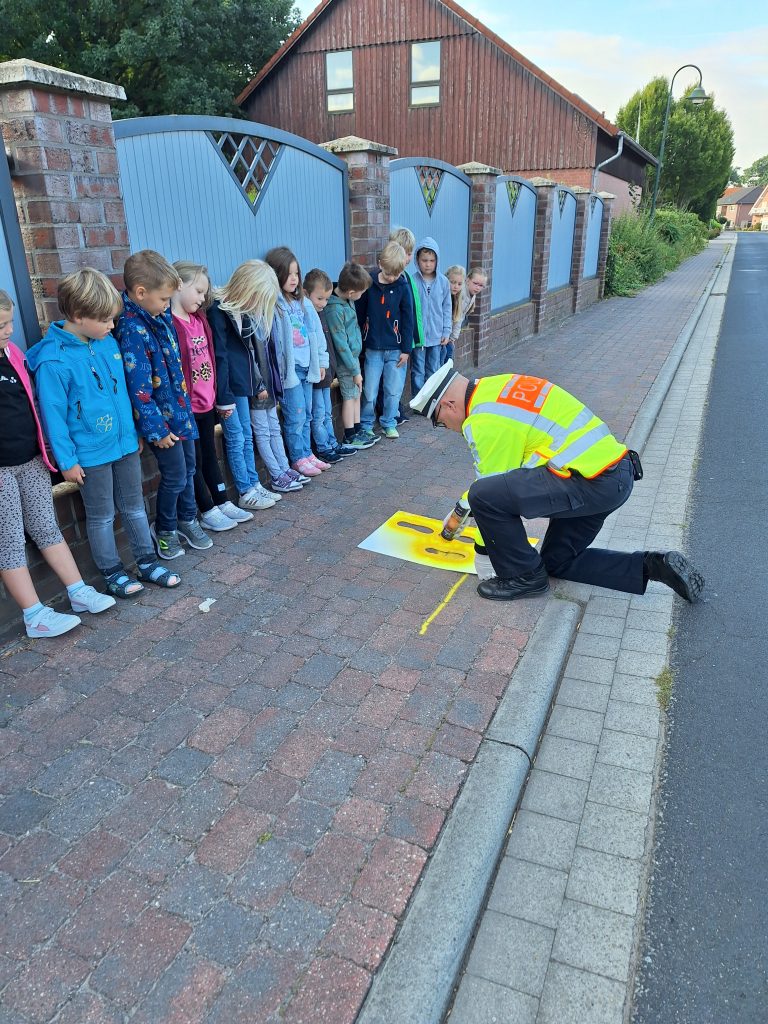 Zu Beginn eines Schuljahres kommt immer Herr Huer von der Polizei Sögel zu uns zu Besuch, um mit den neuen Schülerinnen und Schülern aus Klasse 1 die „gelben Füße“ aufzusprühen. Diese Schulanfangsaktion soll den Erstklässlern zeigen, an welchen Stellen des Schulhofes sie am sichersten zur Schule kommen oder nach Hause gehen können.